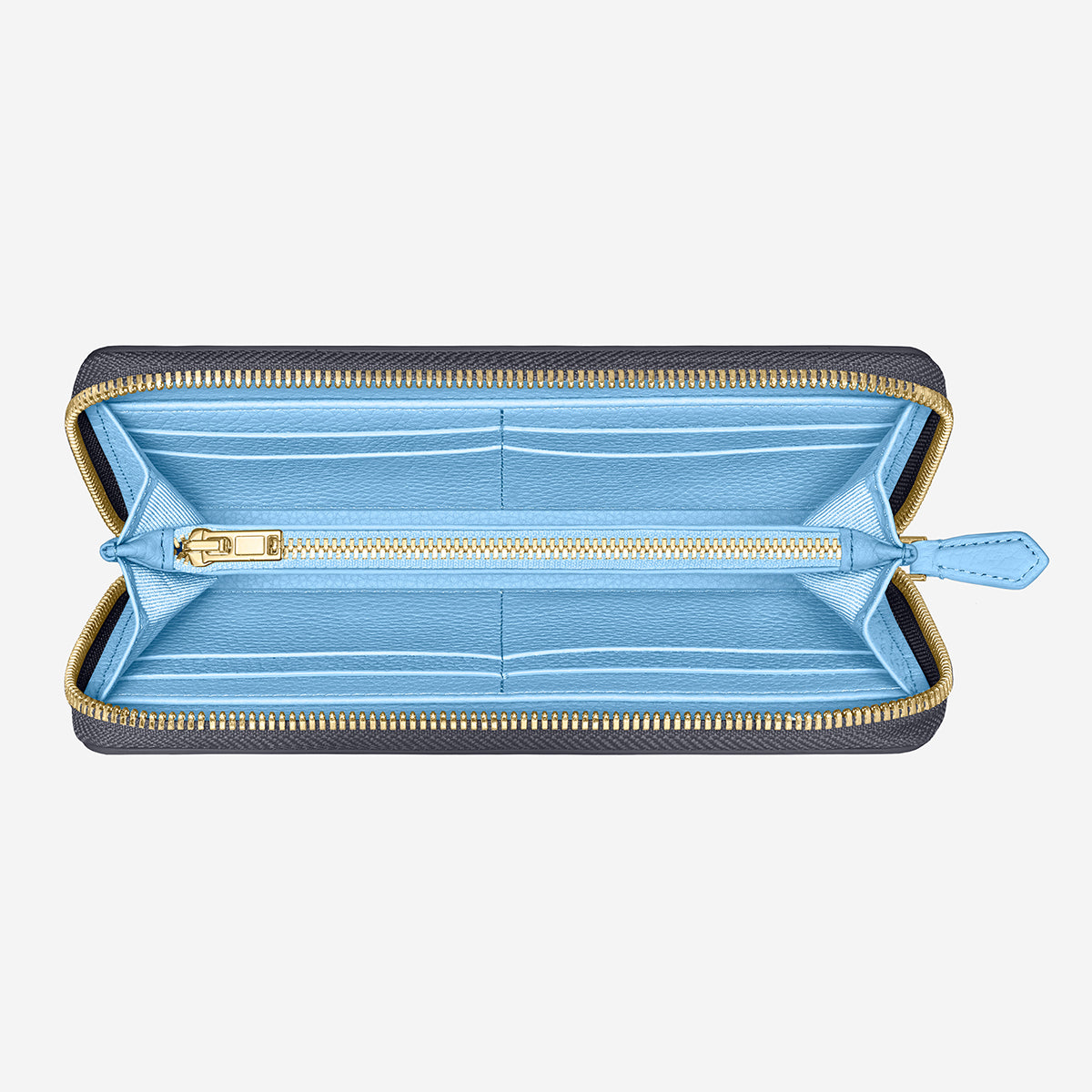 Eight internal card slots, two note compartments and a full-length zipped pocket for coins secure every on-the-go valuable, while a full-length polished brass zipper provides complete protection no matter your surroundings.