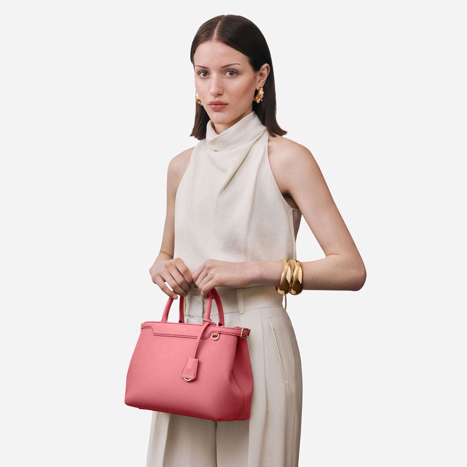 Functional leather belting — with adjustable gold buckles that open up to three sizes — encircles The Medium Palais. It is then finished with signature Sabré Curve detailing and a plush bombé effect as an internal bridge clip secures.