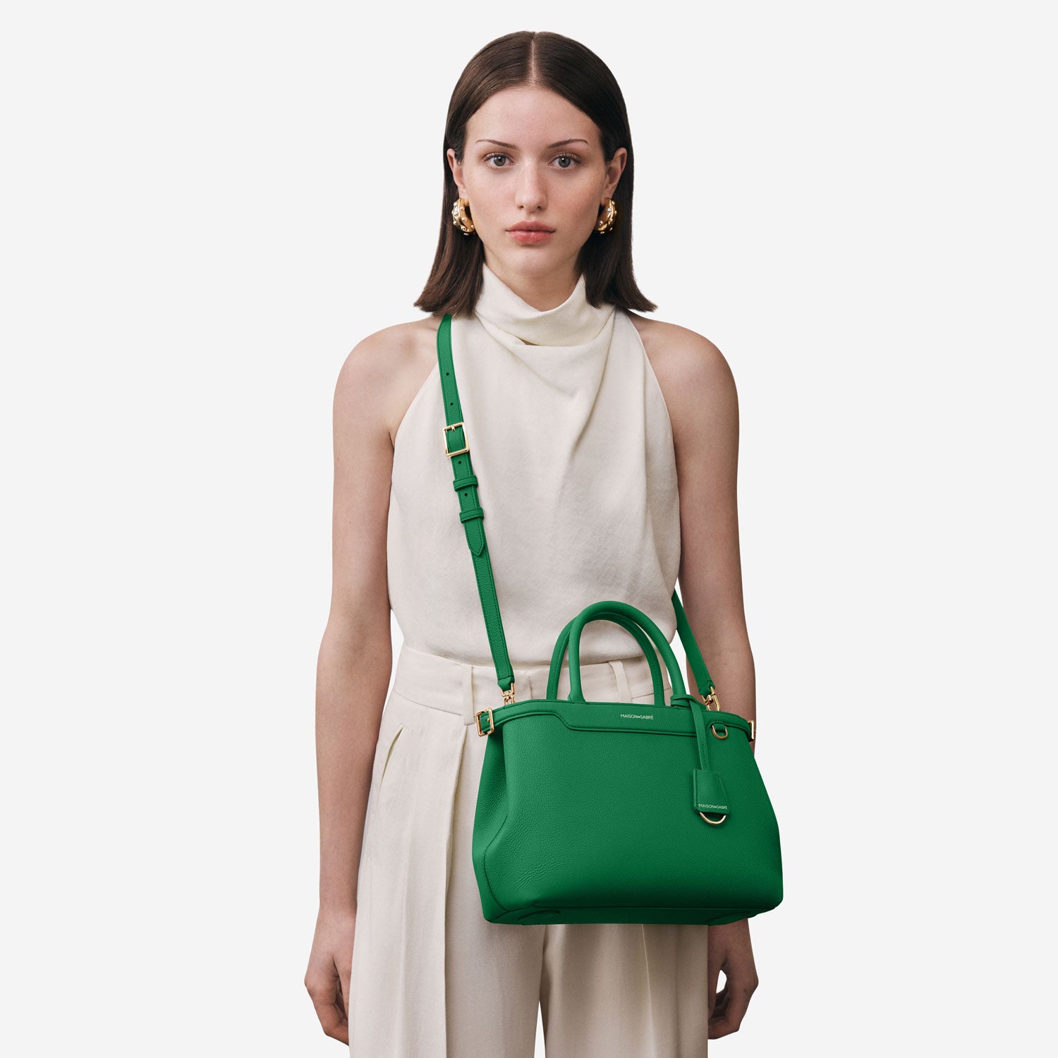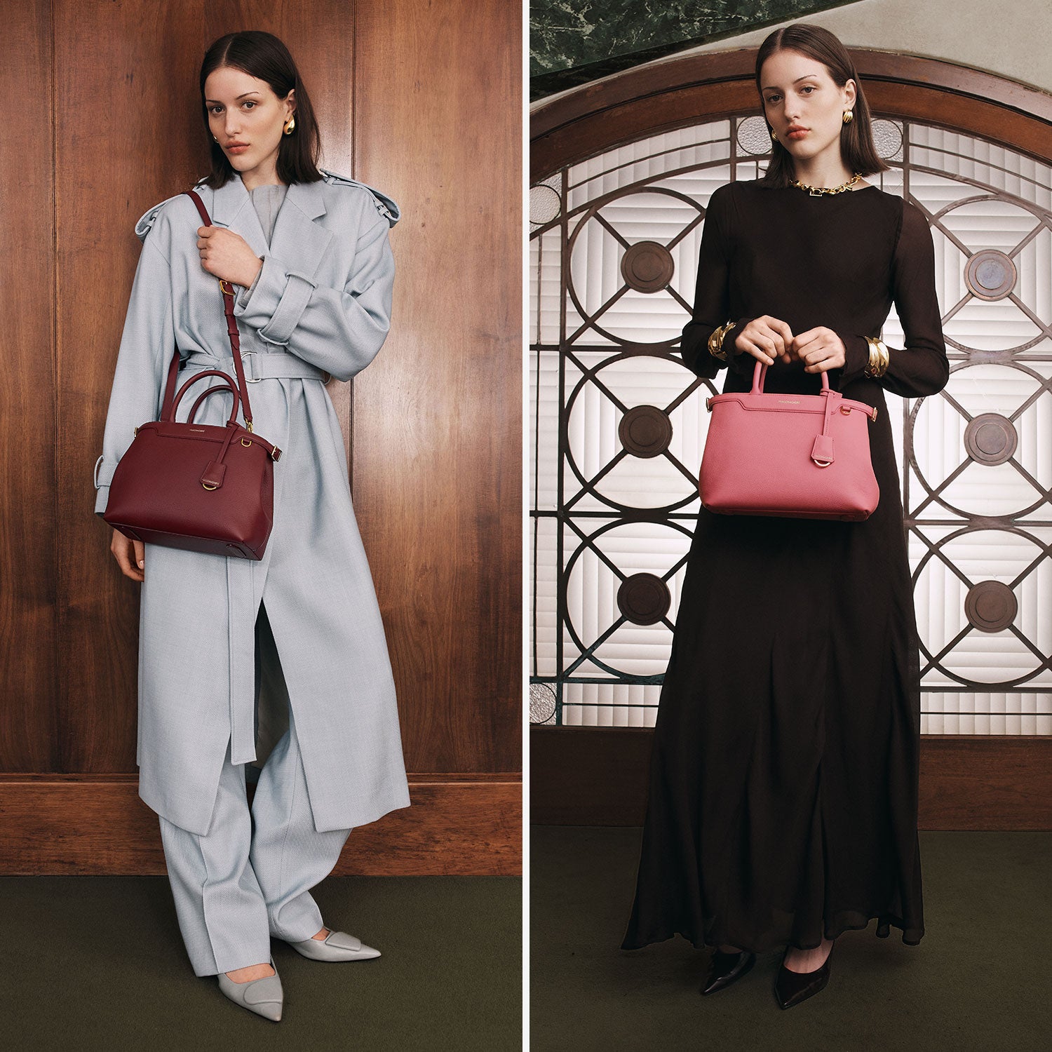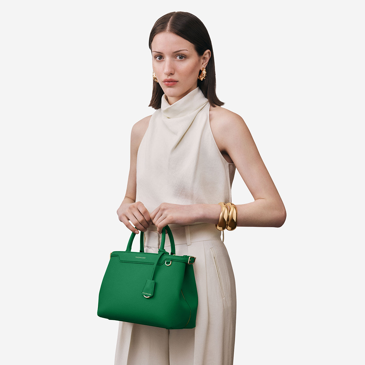 A flagship creation celebrating eight years of MAISON de SABRÉ craftsmanship, The Medium Palais embodies nine iconic brand codes handcrafted in supple calf leather that softens beautifully over time. Its fluid silhouette transports you seamlessly from brunch to gala, with adjustable belting, a secure bridge clip, rolled leather handles, a detachable crossbody strap, and contrast-hued natural suede leather lining exposed at the characteristic sideseam. A generous interior stows an iPhone Pro Max, pouches, a water bottle and daily essentials without compromising form. A SABRÉMOJI™ Charm Link allows for personalisation through signature Charms, while its elegant presence — a smaller sibling to The Large Palais — empowers every ensemble.