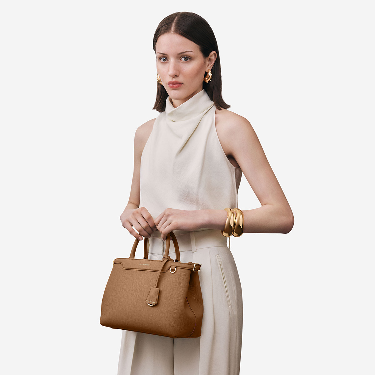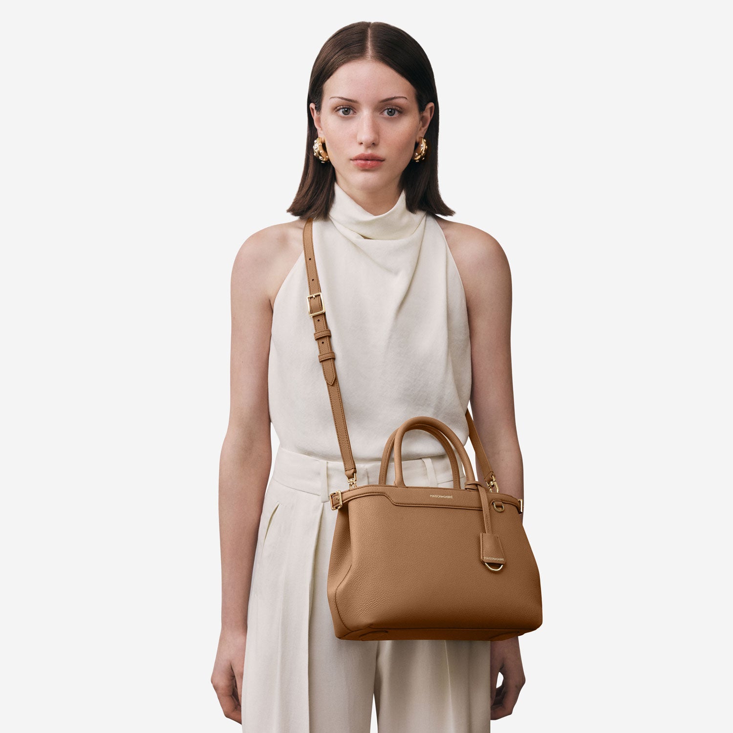 A flagship creation celebrating eight years of MAISON de SABRÉ craftsmanship, The Medium Palais embodies nine iconic brand codes handcrafted in supple calf leather that softens beautifully over time. Its fluid silhouette transports you seamlessly from brunch to gala, with adjustable belting, a secure bridge clip, rolled leather handles, a detachable crossbody strap, and contrast-hued natural suede leather lining exposed at the characteristic sideseam. A generous interior stows an iPhone Pro Max, pouches, a water bottle and daily essentials without compromising form. A SABRÉMOJI™ Charm Link allows for personalisation through signature Charms, while its elegant presence — a smaller sibling to The Large Palais — empowers every ensemble.