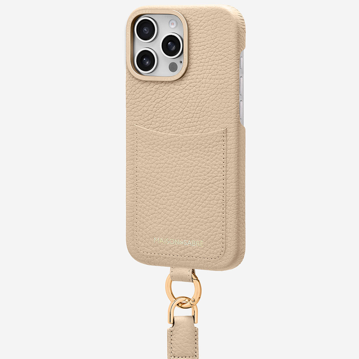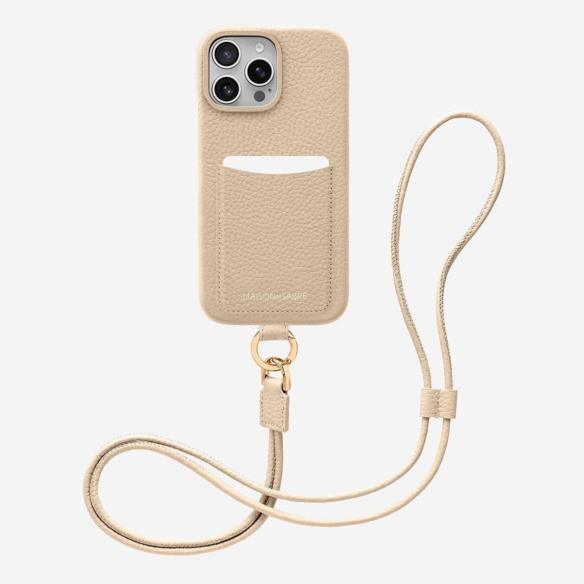 - Includes leather phone case, adjustable leather cord, and high-shine gold hardware
