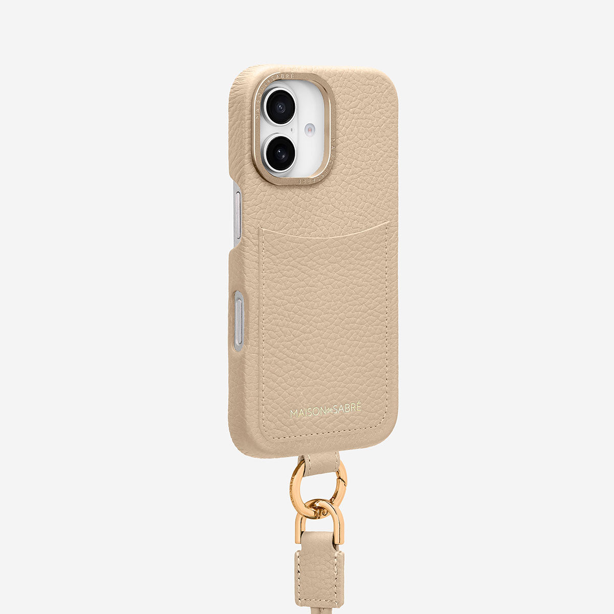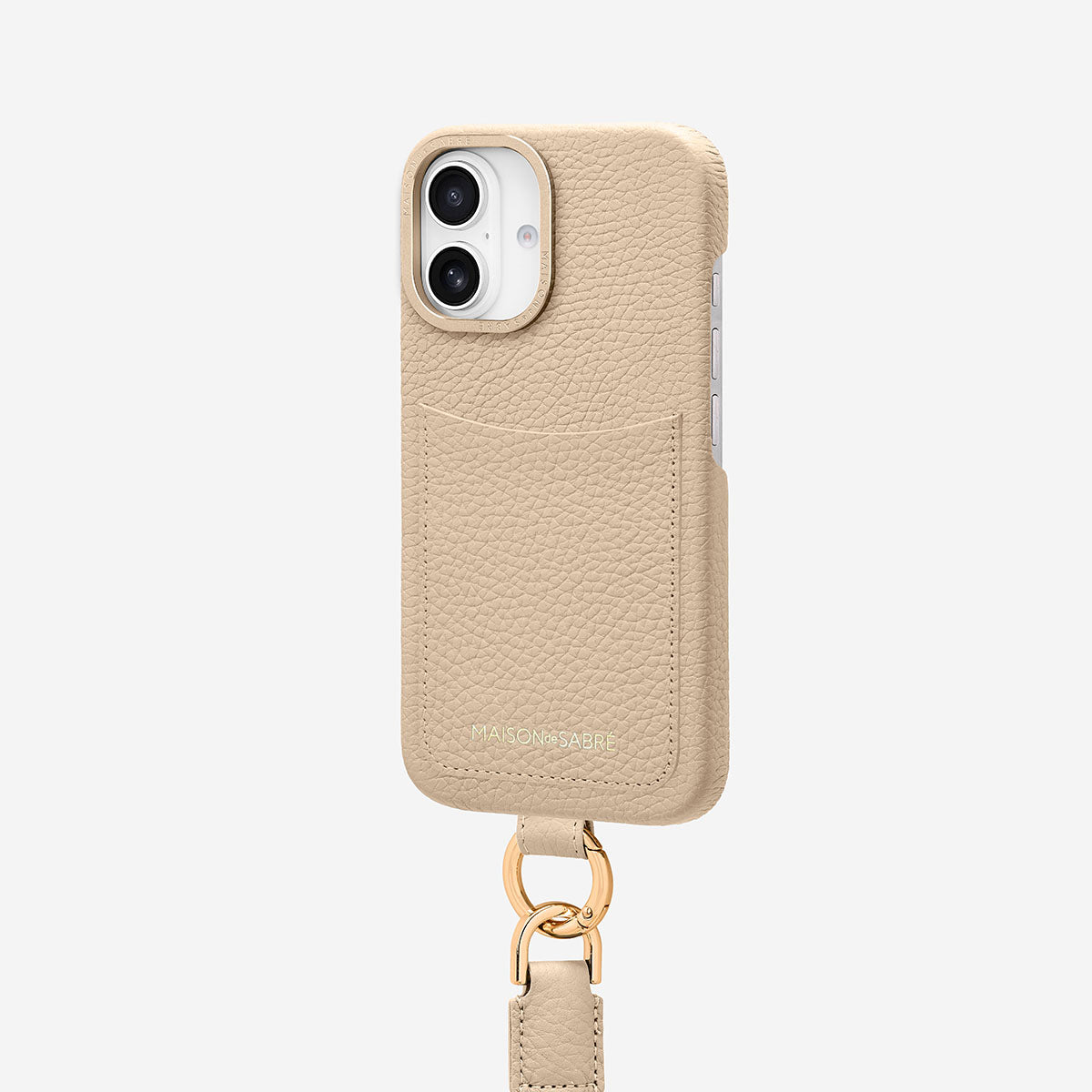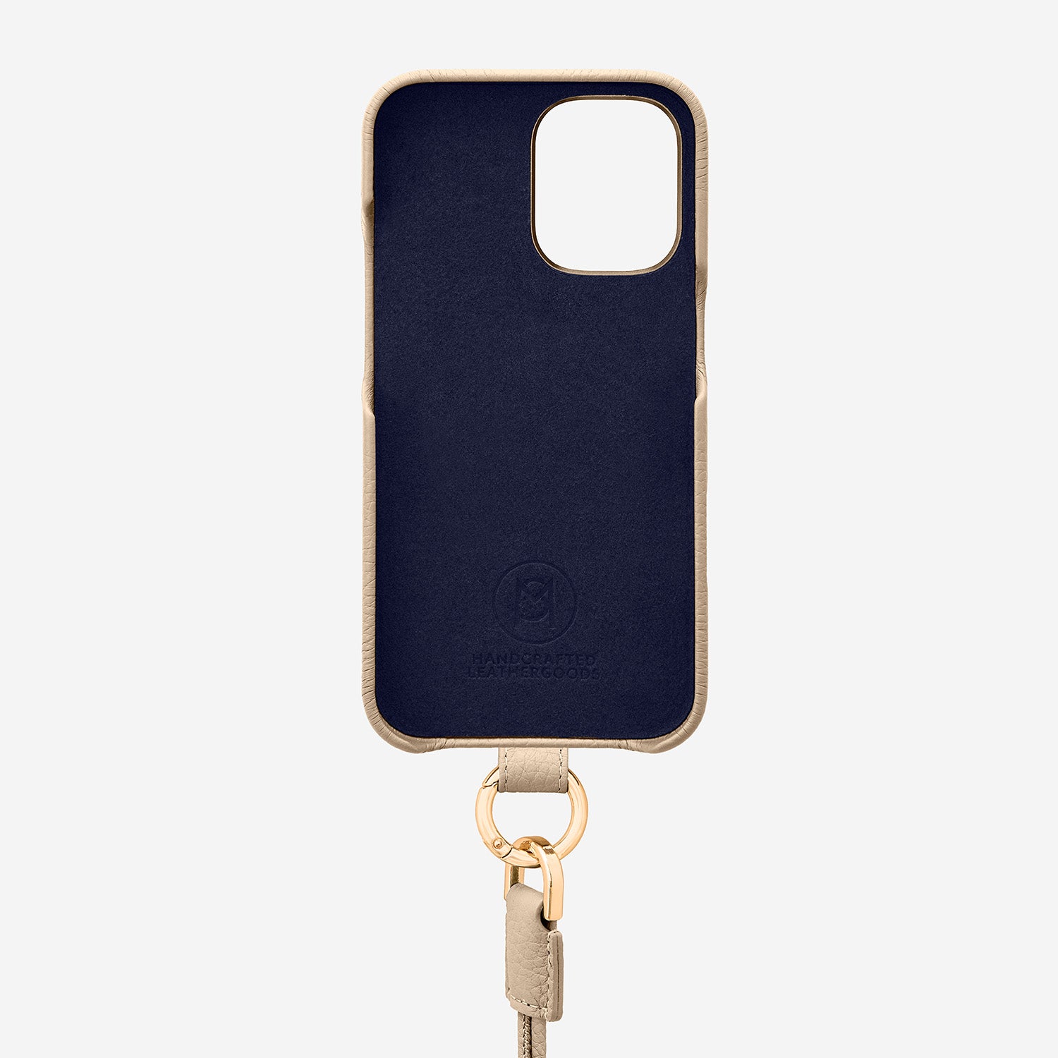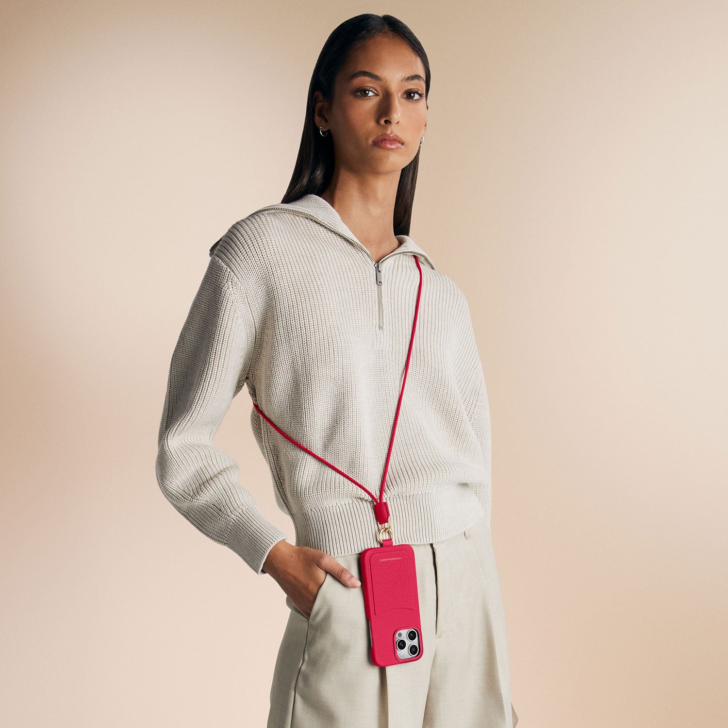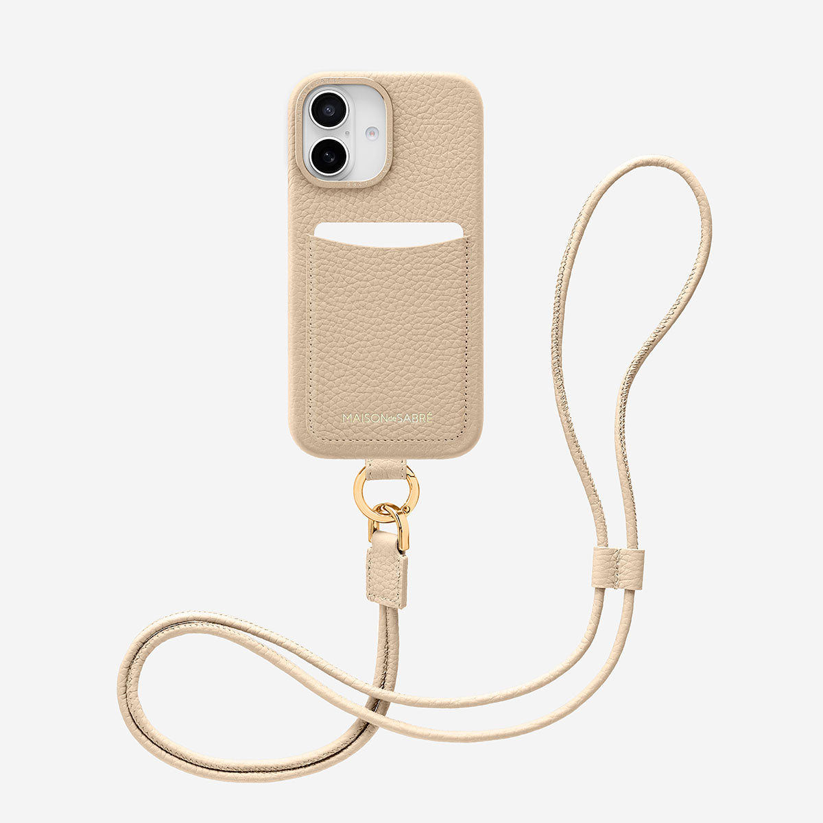 - Includes leather phone case, adjustable leather cord, and high-shine gold hardware
