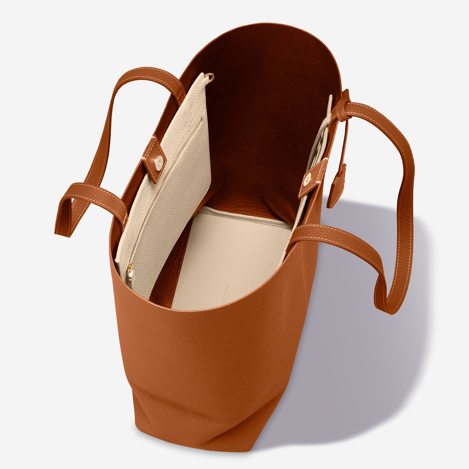 An all-leather construction softens further over time while an unlined interior, floating front and rear panel mid-seams, hanging pockets and structured base provide effortless storage and retrieval.