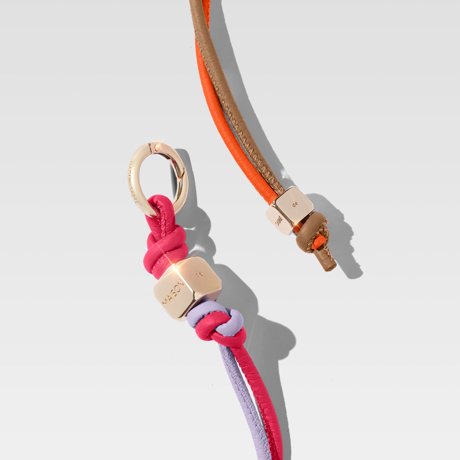 Two individual lengths of full-grain leather rope are finished with corset stitching and securely intertwined via three hand-tied knots. The exquisite final result creates an illusion of one infinite stretch, absent of start or end points.